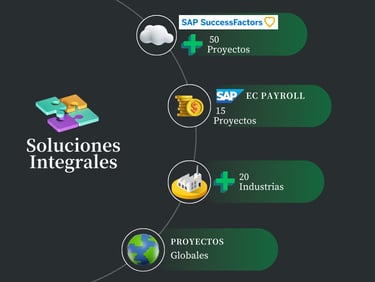 La experiencia de nuestros consultores comprende vivencias y aprendizajes en proyectos globales, en más de 20 industrias, con más de 50 implementaciones de SAP SuccessFactors, además de haber participado en implementaciones de SAP Payroll, lo que nos permite tener una visión estratégica y profunda para ofrecer soluciones integrales en Recursos Humanos.